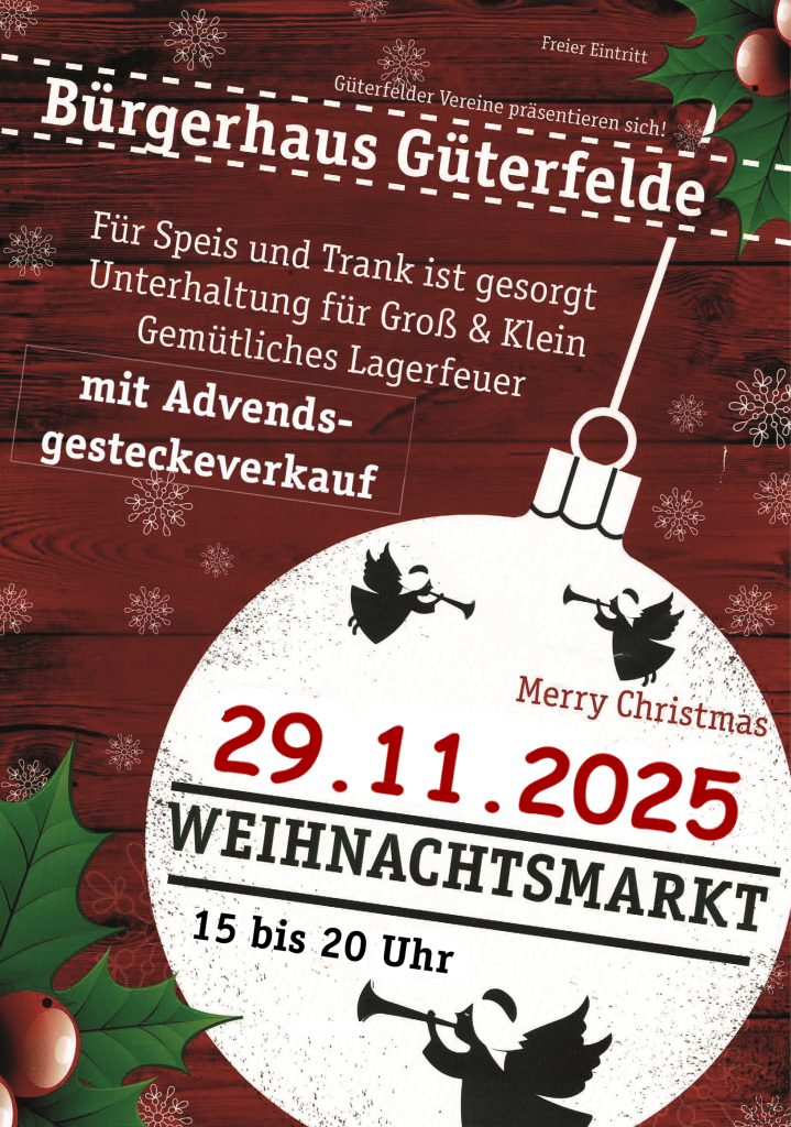 Zum Beginn der Weihnachtszeit beteiligen wir uns am Wochenende des ersten Advents am Weihnachtsmarkt. Im Garten am Bürgerhaus werden Adventsgestecke verkauft, Güterfelder Vereine beisammen sich präsentieren, für Speis und Trank sorgen.